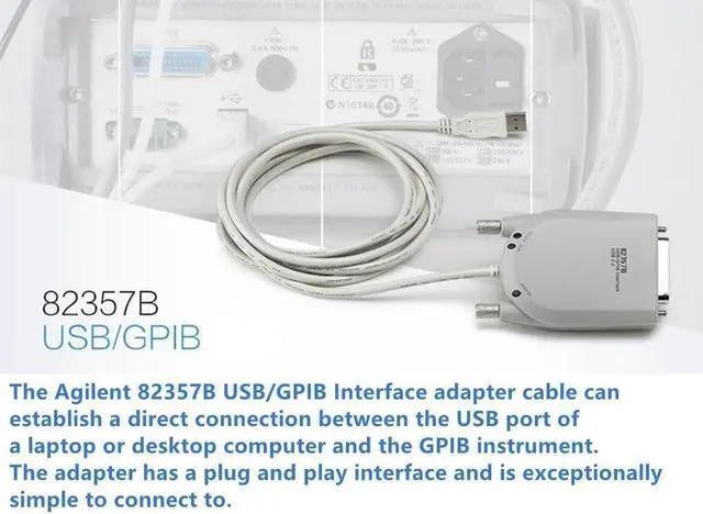 Easy connection - plug and play interface ^^ USB 2.0 interface (compatible with USB 1.1 ) and IEEE-488 interface (for up to 14 GPIB instruments) ^^ High speed - transfer speed over 1.15MB /s ^^ Parallel polling (checking responses of up to 8 devices at a time) ^^ 82357B Keysight USB/GPIB interface adapter cable can establish a direct connection between the USB port of a laptop or desktop computer and the GPIB instrument. There is no need to set switches, install PC cards, and use external power supplies. The adapter has a plug and play interface and is exceptionally simple to connect to.
