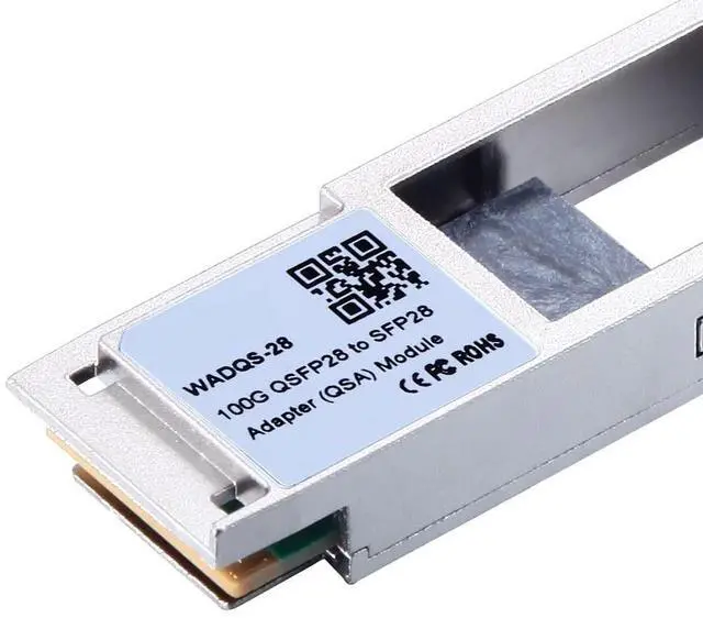 WADQS-28 (Version A) QSA-100, the QSFP28 to SFP28 Adapter (QSA) has a built-in SFP28 adapter under QSFP28 form factor, with data rate up to 25Gbps per channel. This QSA does not support reading SFP DDM info.