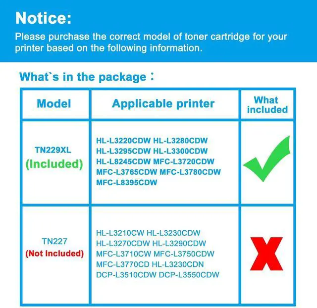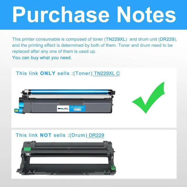 Reliable Quality: LCL TN229XL cartridge uses high quality toner, toner particle size distribution, good mobility, high transfer rate, resulting in a clear image and high gloss print effect; Printing efficiency is high, waste powder rate is low, so as to ensure sufficient page yield.