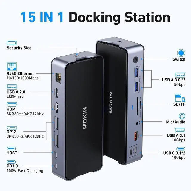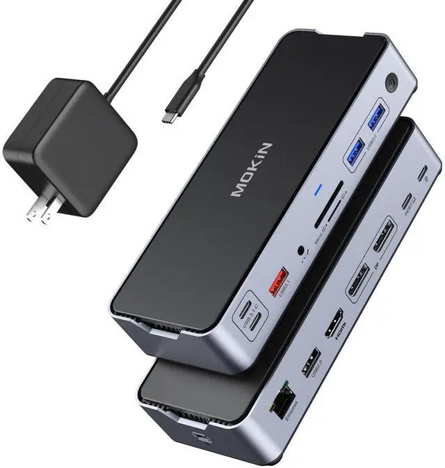 15 IN 1 USB-C Docking Station with Power AdapterThis upgraded MOKiN USB-C laptop docking station comes complete with a dedicated power adapter, enabling full-power operation of all 15 ports including 2x DP, 1x HDMI, 2x USB-C 3.1, 1x USB-A 3.1, 2x USB-A 3.0, 1x USB-A 2.0, SD/Micro SD slots, Gigabit Ethernet, 100W PD charging, and 3.5 mm audio jack. The included power adapter ensures stable simultaneous multi-device connectivity. ^^ 8K Triple Display with Enhanced StabilityWith external power support, this docking station delivers uncompromised performance for triple display setups: single monitor up to 8K@30Hz/4K@120Hz, dual 4K@60Hz, or triple 4K@60Hz+4K@30Hz configurations. The dedicated power supply eliminates bandwidth limitations for crystal-clear output across all displays. ^^ Maximized 10Gbps Data TransferPowered by the included adapter, all high-speed ports (dual USB-C 3.1 at 10Gbps, USB-A 3.1 at 10Gbps, dual USB-A 3.0 at 5Gbps) maintain peak performance simultaneously. Transfer 4K movies in seconds while connecting multiple peripherals without performance drop. ^^ Full 100W PD Charging & Stable NetworkingThe integrated power adapter delivers full 100W charging to your laptop (no power deduction) while supporting all connected devices. Combined with the 1000Mbps Ethernet port, this ensures uninterrupted high-speed internet and stable power for continuous productivity. ^^ Complete