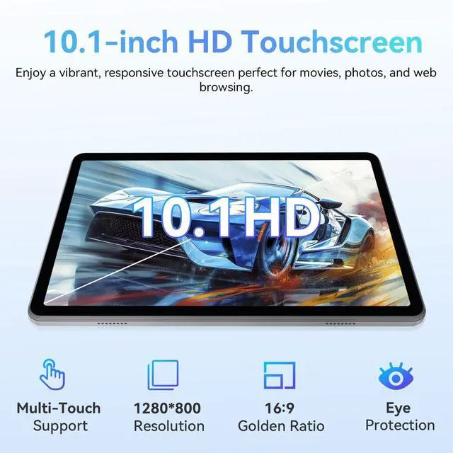 Smooth Performance & Latest Android 15 - Experience seamless multitasking and responsive performance with the latest Android 15 operating system, optimized for speed and efficiency. Powered by a robust octa-core Unisoc T606 processor, this 10.1 -inch tablet handles your daily tasks, browsing, and entertainment with ease. Benefit from the newest Android features, enhanced security, and a user-friendly interface. ^^ Vivid 10.1" HD IPS Touchscreen - Immerse yourself in stunning visuals on the expansive 10.1 inch IPS touchscreen display. With a crisp 1280x800 resolution and a 16:9 aspect ratio, enjoy vibrant colors and sharp details from any viewing angle.