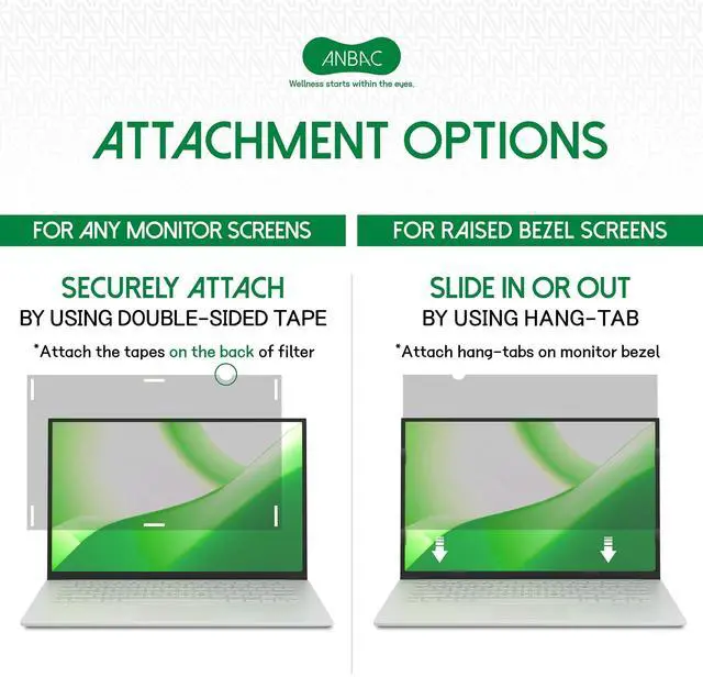 Width: 13 1/2" (345 mm), Height: 7 2/3" (194 mm), Diagonal: 15.6"W 9 ANBAC ATTACHMENT TYPE PRIVACY SCREEN FILTER is compatible with all major brands such as HP, Dell, Samsung, Lenovo, LG, Acer, ASUS, ViewSonic, and the others. Please check your screen's width and height measurement in order to purchase the right filter for your screen size. (We advise that you DO NOT DECIDE your order only based on your screens diagonal size). ^^ PACKAGE CONTENTS - Each package includes one ANBAC privacy screen filter, a quality microfiber cleaning cloth and a set of clear double sided tape & slide mount hang-tabs. Choose between two installation options.