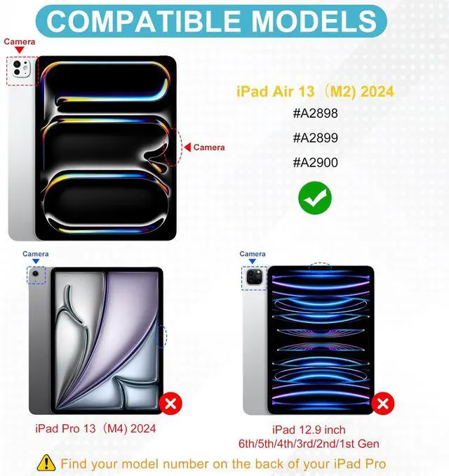 Perfect CompatibilityThis iPad Keyboard case is designed specifically for iPad Air 13 inch Inch M3 2025 M2 2024 Released, (Models: #A2898/#A2899/#A2900) It will NOT work for any other model device. Please check back bottom of our iPad to find the model number. ^^ Detachable Wireless KeyboardThis iPad Air 13 inch case with keyboard features a magnetic design that makes it easy to reposition the keyboard or remove it from the case. Convenient and fast Wireless Bluetooth conection allows you to use the iPad pro 13 keyboard anywhere, anytime. ^^ Multiple Viewing AnglesThe iPad Air 13 inch keyboard case 2024 2025 has 3 grooves to adjust the viewing angle as you like, make your tablet stand steadily. Turn your iPad into a laptop in one second, perfect for studying, working, writing, painting, reading or watching videos. ^^ All Round ProtectionThe iPad Air 13 inch case 2024 2025 is made of soft PU and flexible TPU inner shell, which are drop-proof and scratch resistant, also not slippery or stick while carrying it around, perfect all-around protection for your precious tablet. ^^ Precise CutoutsThe 13 inch iPad Air case precise cutout design allows all functions to be seen at a glance, allowsing full access to all ports: user interface, sensors, speakers, microphone and cameras, providing perfect protection for everyday use. ^^ Apple Pencil HolderThe iPad Air m2 m3 13 inch case with a pencil holder designed for holding your Apple pencil, no need to worry about the stylus getting lost, running around, or inconvenient to carry.