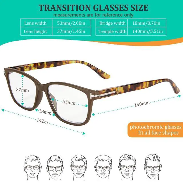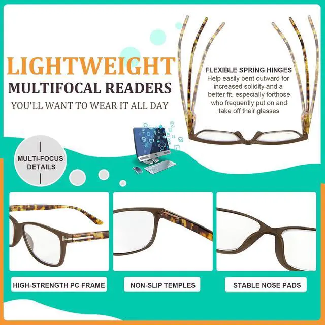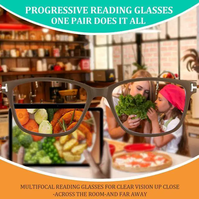 Progressive Reading Glasses LensesOne pair of multifocal reading glasses, perfect for vision. For your computer, your book, and everything in between ^^ Photochromic Reading Glasses Block SunlightProgressive photochromic readers are all-in-one readers that darken in the sun. Enjoy clear vision indoors and automatic sunglasses outdoors ^^ Ultra-Lightweight & Spring HingesLightweight comfort that lasts all day for progressive readers. Under 0.9 oz, shatter-resistant lenses, spring hinges can be opened outwards, and a flexible, non-slip fit for every head ^^ Perfect for Indoor & Outdoor - Seamless Vision Anywhere Your go-anywhere transition reading glasses.