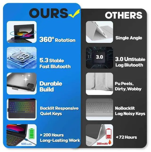 500mAh rechargeable battery offers up to 200 hours of use (backlit off) and 3 hours (backlit on). Stay productive without interruptions whether you're working late or traveling. ^^ Auto Wake up, Sleep &Durable Build- iPad Pro 11 inch keyboard automatically enter into sleep mode once close it to save energy for your iPad and extend standby time. The case is a plastic hard case with all the cut outs in the right places for getting to ports and controls, also offers your iPad full protection to keep your iPad from scratches, dust, wear and tear ^^ Fast Chip &Stable Connectivity- Keyboard case for iPad 10th powered by a premium chip.