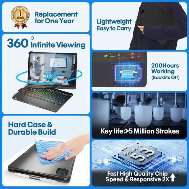 ipad 10th Generation Keyboard Case &1 Year Replacement- Replacement for iPad 10th Generation Case with Keyboard is offered within 1 year by BABG. We provide unlimited customer service support and tech support. Questions will be responded to within 12 working hours. Transform your iPad into a powerful productivity tool and enjoy a seamless, frustration-free experience every day ^^ iPad 11 Keyboard with 7 Use Modes& 360 Rotation Angles -iPad 11th generation keyboard has 360 degree swivel & 180 flip, Turn Your iPad into a lighter, more portable version of a Laptop. Your iPad screen will have multiple viewing angles.