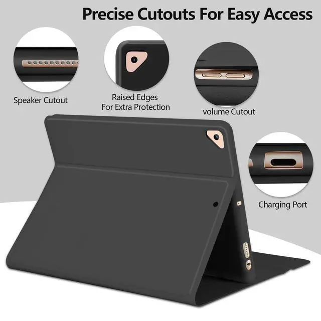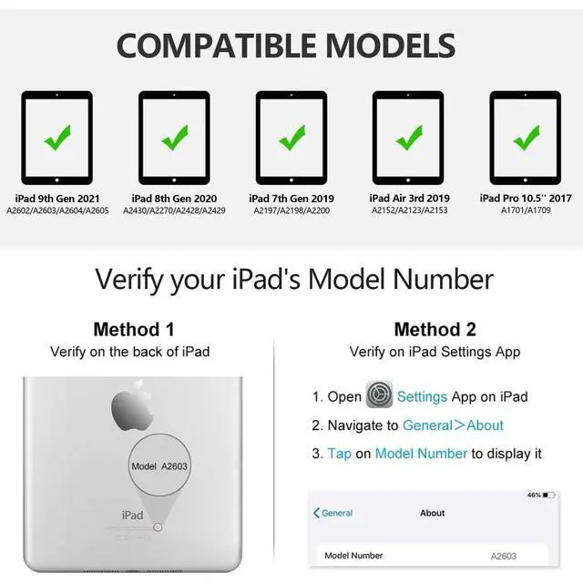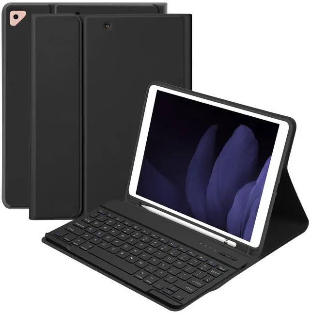 Pro 10.5 -inch 2017 (model: A1701/A1709/A1852). Please check your for iPad model before purchasing. ^^ Auto Sleep & Wake FunctionThis for ipad 9th generation case with keyboard is adopted an auto sleep/wake function. It allows your tablet automatically get into sleep mode when you close case and automatically wake up again when you open the case, which is great for power saving. To achieve the maximum effect of auto sleep wake function, please remove the magnetic wireless keyboard, since the keyboard with iron can reduce the mutual attraction between the magnets. ^^ Heat Release & Whole Body ProtectionOur for ipad 8th generation case with keyboard is adopted honeycomb grid pattern design which is better for heat release and anti-skid. Thoughtful design to effectively extend life of your beloved tablet. Solid keyboard case and shock absorption provide perfect protection for ipad 10.2 9th 8th 7th generation 2021 2020 2019 from scratches and damage. ^^ Adjustable Viewing Angles & Pencil HolderThis for ipad 7th generation case with keyboard has 3 adjustable viewing angles: 120, 125, 130, which provides a comfit visual experience and meet different needs. Our for ipad 9th generation case with keyboard also has a pencil holder which is convenient to store your pen.