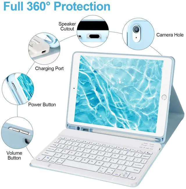 a multi-functional experience: Typing, reading, gaming. Easily adjust to the most comfortable angle for you. The secure magnetic closure allows you to take the keyboard and hard case with you wherever you go. ^^ Advanced Protection & Precise CutoutsThe keyboard case iPad 10.2 for ipad 9/8/7th Gen features a non-slip design that provides full protection from fingerprints, impacts, scratches and dust. Prevent scratches, bumps or dents, and protect your iPad 9th generation from all kinds of drops. The ports on the hard case are precisely cut to allow access to all functions. Our keyboard cases provide you with a smart, stylish and functional solution.