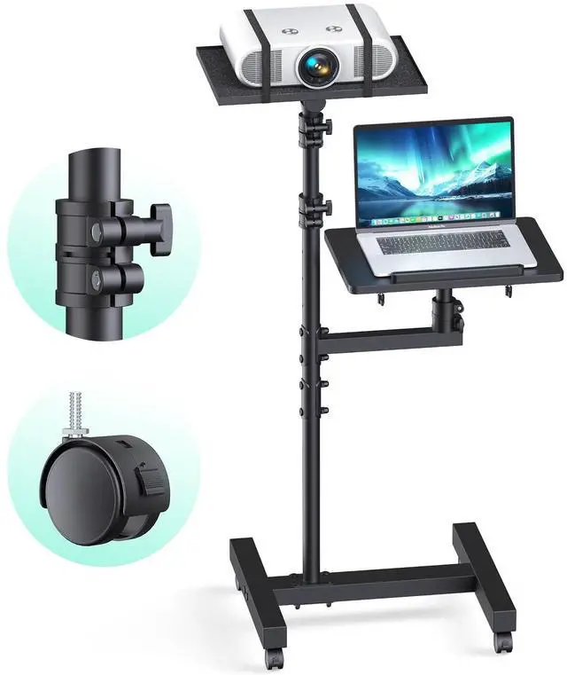 Lockable Casters: Equipped with four high-quality, silent-rolling casters that swivel 360 this rolling projector tripod stand moves smoothly across surfaces. The casters feature locking mechanisms for added safety and stability when positioned, allowing for easy relocation and setup adjustments ^^ Sturdy