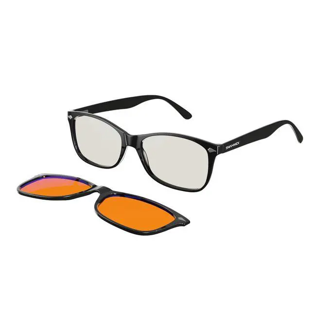 DescriptionBlue light protection during the day and night is now a "snap". Swannies 2 in 1 Snap-On Glasses offer the best blue light blocking, no matter the time of day, in a single convenient package. Classic Day Swannies transform into Classic Night Swannies in an instant with simple embedded magnets. Top frame lenses attach to the base frame magnetically, securely holding them in place. Remove the top lenses in a matter of seconds by simply pulling them away from the base frame. Swannies Day Lenses block the wavelengths of blue light which causes digital eye strain, headaches and fatigue.