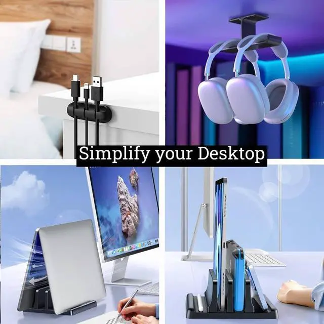 Desk Space Saver Bundle: Adjustable Vertical Laptop Holder, Under-Desk Headphone Mount & Silicone Cable Organizers - Tidy Workspace Solution