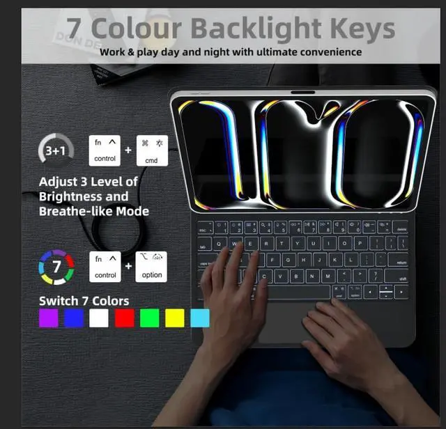 Keyboard with Shortcuts: This tablet keyboard cases is equipped with 7 colors backlit, 3 adjustable backlight brightness levels brings you a comfortable typing experience in any conditions, fn (control) key + cmd key: Combination