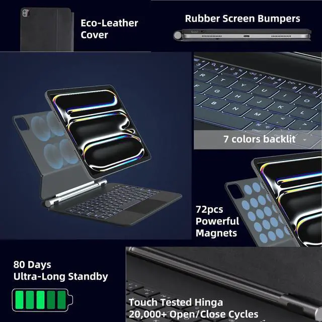 Easy-Set Floating Cantilever Stand: magic keyboard allows your iPad Pro 11 to float stylishly over your keyboard and gives you the perfect angle just by opening the case, 7 colors backlight and a multi-touch trackpad whether you are in the cafe, school, or office; change to high-efficiency mode within a second, bringing your work efficiency. You can also wake up or sleep your iPad by opening or closing your keyboard case. ^^ Backlight
