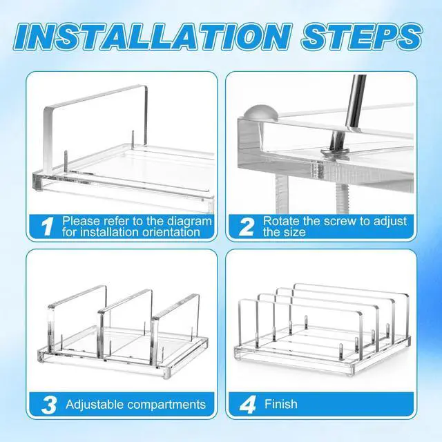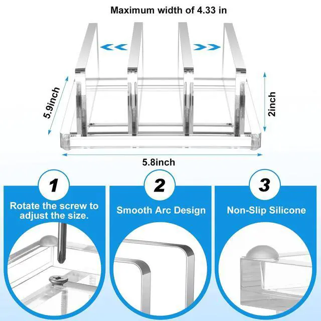 • Adjustable Compartments: there are 3 slots, which can be adjusted to a maximum width of 4.33 inches; You can adjust the size of the slots according to your needs; Please read the installation step diagram and install in the direction indicated in the picture