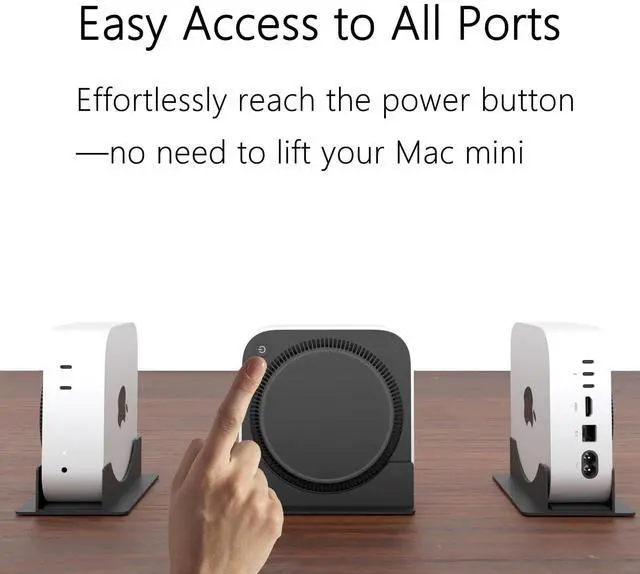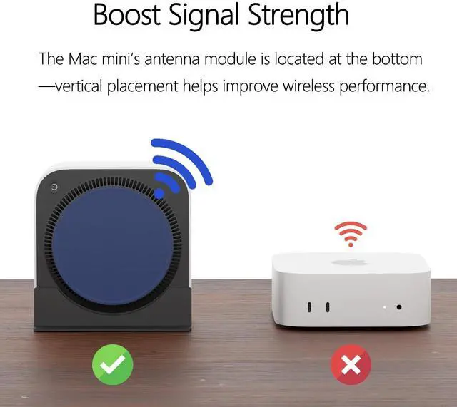 Tailored for Mac mini M4 2024/ Pro - Designed specifically for the latest Mac mini M4 2024/Pro, this stand ensures a precise fit and keeps all ports and the power button easily accessibleno need to lift the device. ^^ Better Airflow, Better Performance - Vertical positioning improves heat dissipation and airflow around your Mac mini, helping it run cooler and maintain peak performance during demanding tasks. ^^ Boosts Wireless Signal - Mac mini M4's antenna module is located at the bottom. Flat placementespecially on metal deskscan block signal. Vertical positioning lifts it for stronger Wi-Fi and Bluetooth reception.