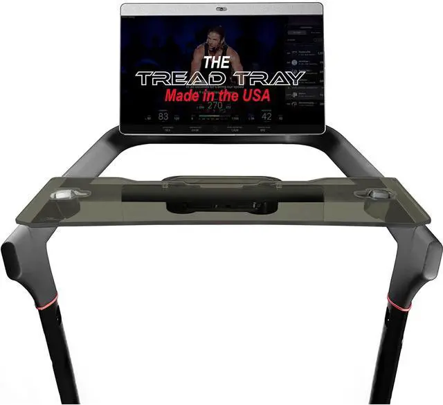The Tread Tray 2.0 (BLACK): Kick your productivity into high gear! Compatible with Peloton Tread. (Smaller treadmill, DOES NOT FIT TREAD PLUS) The Tread Tray 2.0 by TFD seamlessly turns your compatible treadmill into a functional dual-purpose workstationwork, meet, read, or watch TV while you walk or jog. This supportive acrylic tray table fits onto your handlebar and is the perfect laptop tray or holder for your tablet, phone, books, and more. * DOES NOT SUPPORT PELOTON TREAD+ ^^