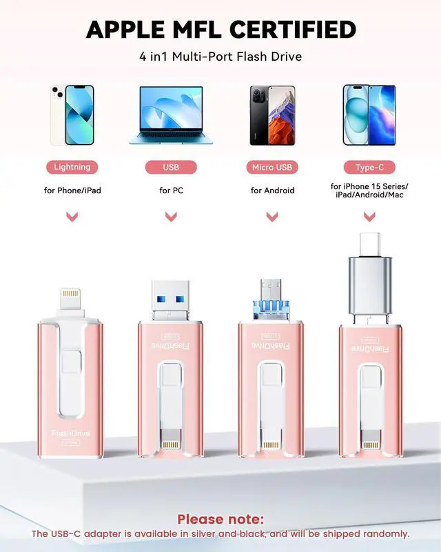 Note: The displayed capacity may differ from 256GB/512GB due to different calculation methods between storage manufacturers (1GB=1000MB) and computers (1GB=1024MB). ^^ Multi Port Design, Plug and PlayEquipped with USB/Lightning/Micro USB/Type-C (with independent adapter), this usb storage flash drive supports a variety of devices for effortless plug and play operation. Quickly transfer data between different devices, significantly enhancing convenience.