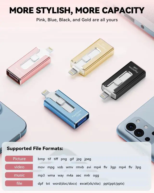 Note: Actual speeds may vary based on device and processor performance. ^^ Stylish, Portable, and SecureWith a compact and stylish design, this flash drive for iPhone is available in blue, pink, black and gold, making it easy to carry around. The built-in encryption option allows you to set a password via the APP to secure your personal files, photos and videos, ensuring you have peace of mind when storing and accessing your precious memories while traveling or for daily use.