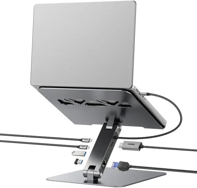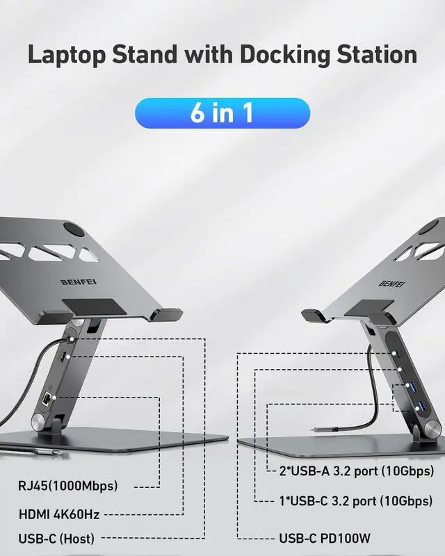 Ergonomic DesignBENFEI Laptop stand can be easily adjusted to comfortable height and angle based on your actual need with sturdy and supportive. Height adjust from maximum 178mm to minimum 68mm. Affordable laptop weight is 4.5 kilogram, product dimension is 250*240* 53.3 mm. ^^ Stable & Durablelaptop stand is made of aluminum alloy, thus gives the stand a more stable performance, Anti-skid silicone can protects your laptop from sliding. Thanks to BENFEI's end-to-end in-house aluminum production capability, in-house PCBA and assembly capability, give your best solution of laptop stand with docking station.