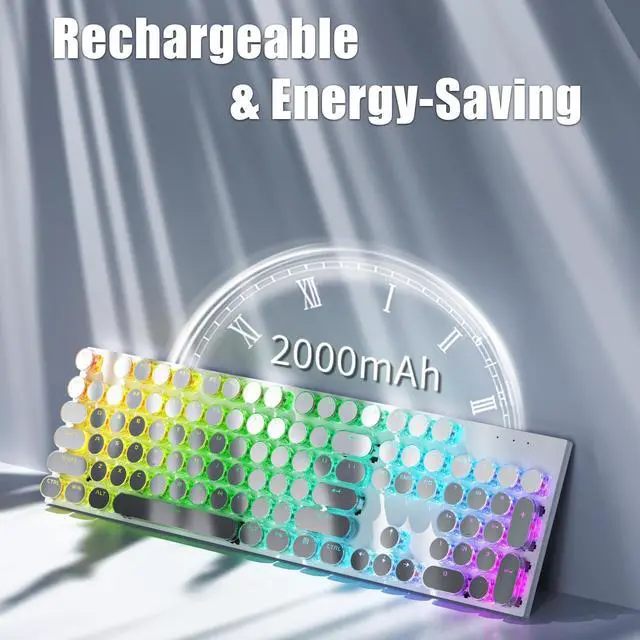 Linear red switches feature fast action with minimal resistance without tactile bump feel and the sound is quiet when the button is pressed lightly. Combining an aesthetic retro look with advanced technology, this keyboard will give you a unique typing experience. ^^ [True RGB LED Backlit] - This RGB illuminated keyboard has up to 20 LED backlight modes. It supports single color and RGB colors. Press "FN+Tab" to change the backlight color. Press "FN+" to change the backlight mode. You can also adjust the brightness and speed of the lighting effects. ^^ [Rechargeable & Energy-Saving] - The keyboard has a 2000mAh lithium battery, with low-power chip and energy-saving technology.