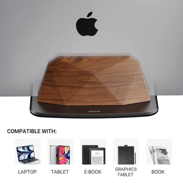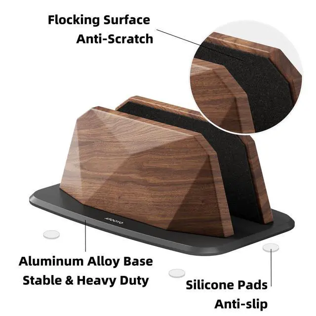 Protection and Stability: Equipped with a flocking cushion and non-slip silicone spots, the stand protects your laptop from scratches and prevents it from sliding or shifting. The combination of these materials ensures that your device stays securely in place while avoiding damage to both the laptop and the stand. ^^ Stable and DurableCrafted from high-quality wood side panels and sturdy aluminum alloy base, this laptop stand is designed for long-term stability and durability. The precision-engineered connections between the base and wooden legs prevent loosening and ensure stability. The stand's design also prevents slipping, keeping your device securely in place. Whether in a busy office environment or at home, this stand provides reliable support for your laptop. ^^ Easy to InstallInstalling this laptop stand is straightforward and quick. Simply follow the instructions to tighten the screws on the base and wooden legs, and adjust the movable slots. No complex tools or cumbersome steps are required, making assembly easy and efficient. This simple installation process saves you time and hassle, allowing you to focus on enhancing your productivity.