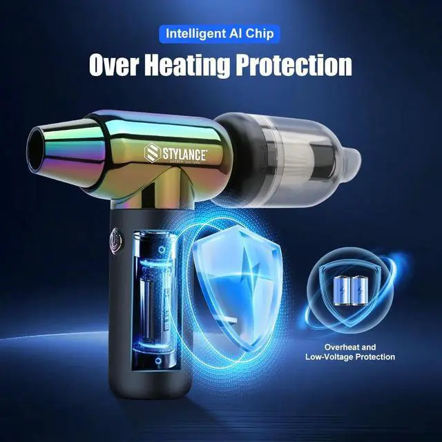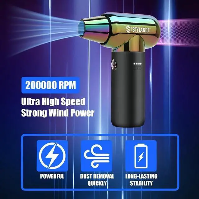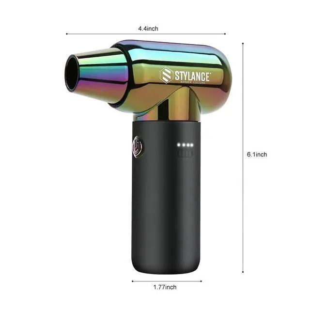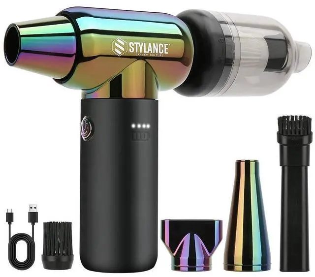 Elevate your styling game with this professional-grade cordless hair dryer from Stylance. The sleek design features an iridescent neo-chrome finish that's as stylish as it is functional. This compact yet powerful tool comes complete with a charging base, removable filter for easy maintenance, and a convenient USB charging cable. The ergonomic gray handle provides comfortable grip during use, while the lightweight construction reduces arm fatigue. Perfect for both home use and travel, this innovative dryer combines modern technology with practical design. The kit includes everything needed to achieve salon-quality results, all beautifully presented in protective foam packaging.