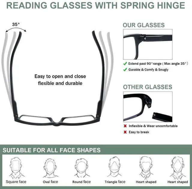 ^^ [Flexible Spring Hinges]: The adjustable spring legs can find the perfect fit for small wide & oversized face without uncomfortable pinching& stress; Anti slip nose pads stops eye glasses form sliding down.