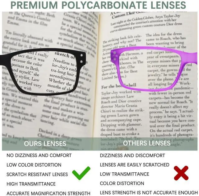^^ [Materials]: High quality plastic frames, durable, flexible, lightweight; Anti-reflective clear HD lens and accurate magnification strength can reduce chromatic aberration. Casual frame design keeps you looking professional and stylish while working or playing video games.