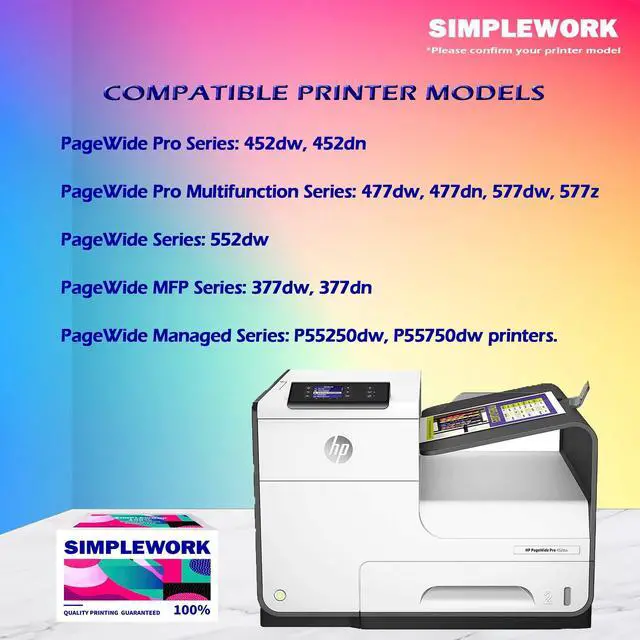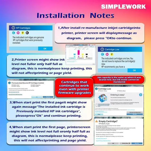 advantage1. This remanufactured ink cartridge is inexpensive and compatible with both old and new versions of printer firmware. There will be no incompatibility due to updating the printer firmware, and the maximum use of this ink cartridge will greatly reduce the purchase risk. 2. SIMPLEWORK has undergone comprehensive multiple print quality tests, and the high-quality ink cartridges print smoothly without clogging to ensure the best performance. 3. Thoroughly tested for color strength, SIMPLEWORK prints fast-drying documents, text and crisp graphics with professional blacks and vibrant colors, ensuring true-to-life printouts.