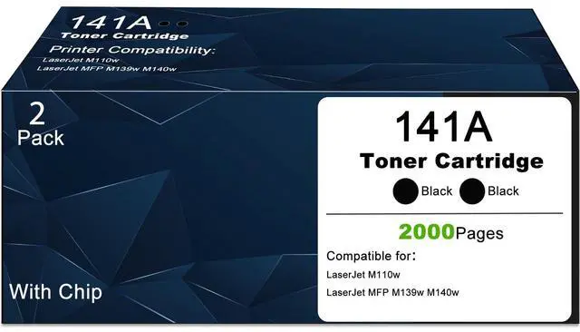 Latest Chip Version The 141A W1410A toner cartridges are equipped with the latest upgraded chip for instant printer recognition and seamless compatibility. ^^ Package Contains Includes 2 new 141A black toner cartridges, delivering a total yield of 2, 000 pages. ^^ Broad Printer Compatibility W1410A 141A black toner cartridge compatible with LaserJet M110w, MFP M139w, and MFP M140w printers for stable and reliable performance. Not compatible with LaserJet M110we, M139we, M140we printers. This W1410A 141A black toner is also not compatible for H P+ service or any e-series printers.