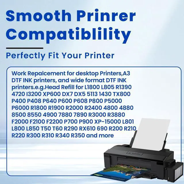 Compatibility: Our DTF ink is designed for use with both 6-color and 8-color printers that can be converted to DTF using Cadlink software. It is compatible with desktop A3 DTF printers and wide-format DTF printers, including but not limited to the following models: L800, L1800, L805, R1390, 4720, I3200, XP600, DX7, DX5, 5113, 1430, TX800, P400, P408, P640, P600, P608, P800, P5000, P6000, R1800, R1900, R2000, R2400, 4800, 4880, 4900, 7880, 7890, R2880, R3000, R3880, F2000, F2100, F2200, P700, P900, XP-15000, ET8500, ET8550, and more ^^ Premium