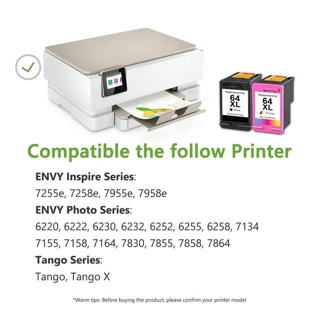 Compatible Printers: 64XL ink replacement for hp Envy Photo Series 6220, 6222, 6230, 6232, 6252, 6255, 6258, 7134, 7155, 7158, 7164, 7830, 7855, 7858, 7864, ENVY