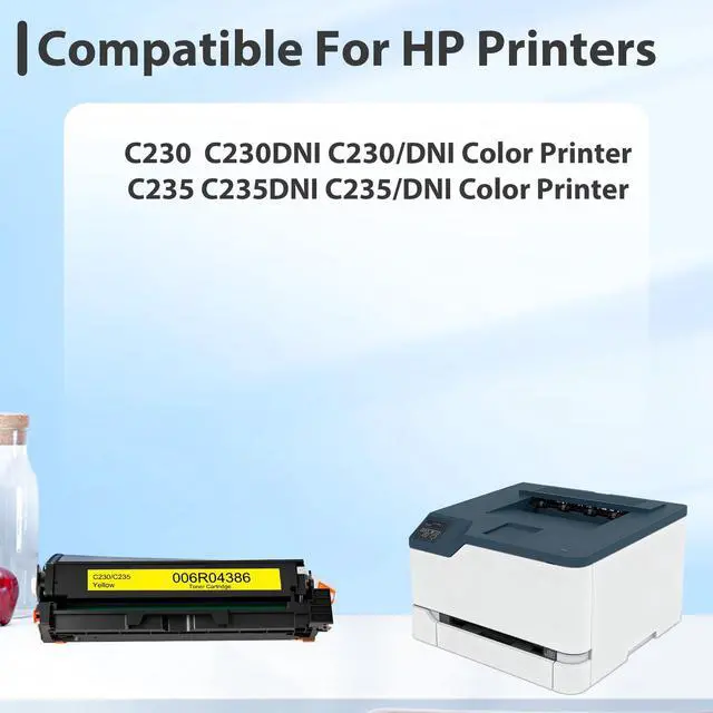 Package Contents 1-Pack C230/C235 Yellow Toner Cartridge High Capacity ^^ Compatible Printer for Xerox C230 C235 C225 C230/DNI C235/DN Printer ^^ Cartridge Model006R04386 / 006R04394 Yellow High Capacity Toner Cartridge, C230/C235 ^^ High Capacity Up to 4, 500 pages per c230/c235 yellow ink cartridge ^^ Excellent Performance all c230 c235 c225 toner cartridge yellow are tested to the most rigorous quality, ensure smooth, clean printed text and vibrant color images
