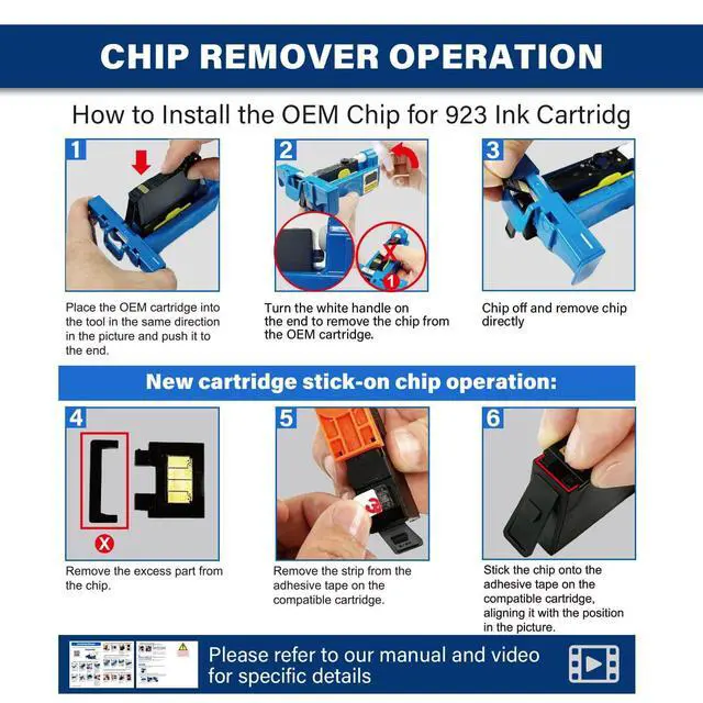 ^^ Installation steps: 1. Use the provided tool to remove the original chip from the cartridge. 2. Tear off the tape on the new compatible cartridge and stick the chip firmly on to complete the chip installation. 3. If you have any questions about the product, please feel free to contact us (or check out the video installation tutorial on the product page).