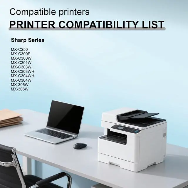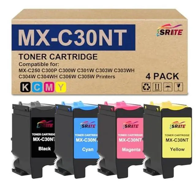 Compatible With Printers: MX-C250 MX-C300P MX-C300W MX-C301W MX-C303W MX-C303WH MX-C304WH MX-C304W MX-305W MX-306W Printers ^^ Original No.: Black MX-C30NT toner(MX-C30NT-B), Cyan MX-C30NT toner(MX-C30NT-C), Magenta MX-C30NT toner(MX-C30NT-M), Yellow MX-C30NT toner(MX-C30NT-Y) ^^