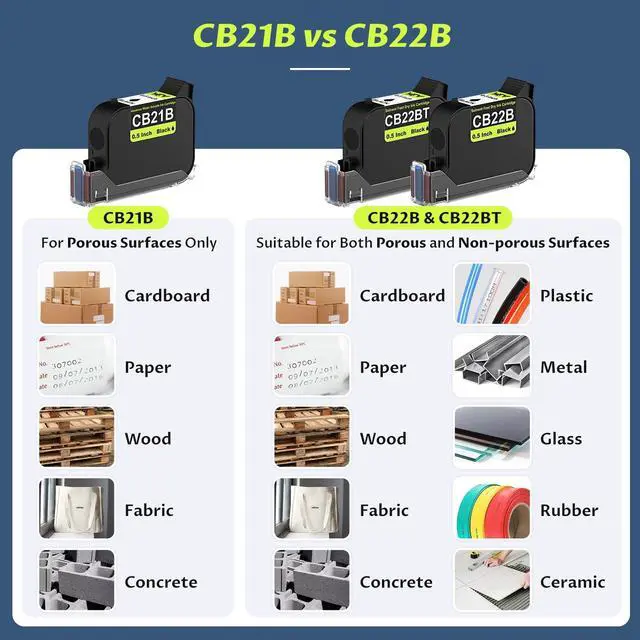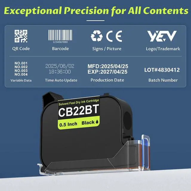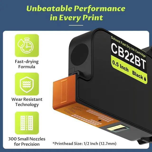 Yev Printers: Designed specifically for Yev handheld inkjet printers, the CB22B is an authentic solvent based fast drying cartridge that incorporates a 0.5 -inch ( 12.7 mm) printhead. ^^ Fast-Drying on