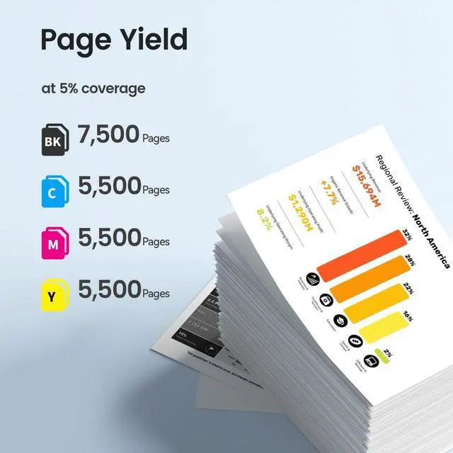 Page Yield: Black ink is 7, 500 pages & color is 5, 500 pages per cartridge at 5% coverage on letter/a4 ^^ High