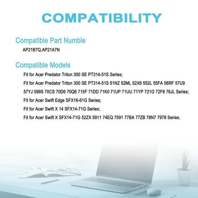 Condition: 100% brand new from manufacturer. ^^ Replacement Battery Part NumbersAP21B7Q, AP21A7N. ^^ Compatible ModelFit for Acer Predator Triton 300 SE PT314-51S Series; Fit for Acer Swift Edge SFX16-61G Series; Fit for Acer Swift X 14 SFX14-71G Series ^^ After-Sales SupportWe support 30 days refund, 12 months warranty (refund or replace battery), 24 x 7 mail support. return window will close one month after you receive the product and you can contact us by placing your order or by clicking " Ask a question" on the seller's page.