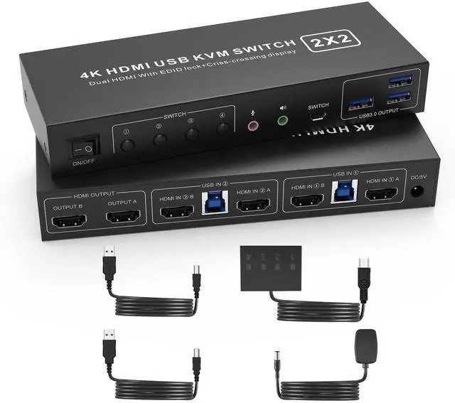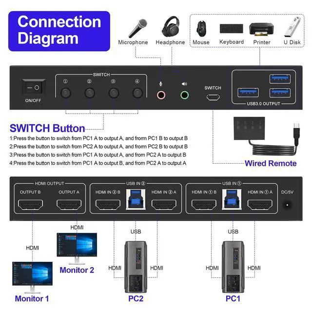 USB 3.0 Ports: Dual monitor HDMI USB switch with 3 USB 3.0 ports for sharing keyboard, mouse, printer, scaner and other USB devices. supports ultra-fast USB 3.0 data transfer up to 5Gbps, backward compatible with USB 2.0 / 1.1 devices; Also supports separate audio and microphone output ^^ Convenient Switching modes and
