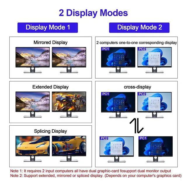 Dual Monitor KVM Switch: Ideal for access 2 PC with 2 monitors and 1 set of keyboard mouse. You can easily have a dual monitor setup per system or switch it to a single monitor system showing both systems (one on each monitor) and then easily toggle the keyboard/mouse between the 2 systems. Only when your computer supports dual display or multi display, you can use this KVM to achieve 2 PC to share 2 monitors ^^ Multiple