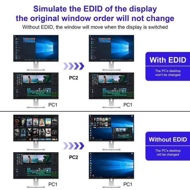 Support Simulation EDID: This kvm switches can simulate the EDID of the display, store the resolution and refresh rate of the display, With EDID emulators in each input port, your computers always receive the correct display information and preventing displays setting change while switching inputs in display mode