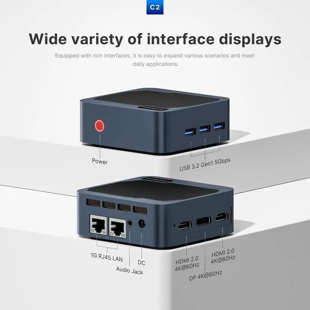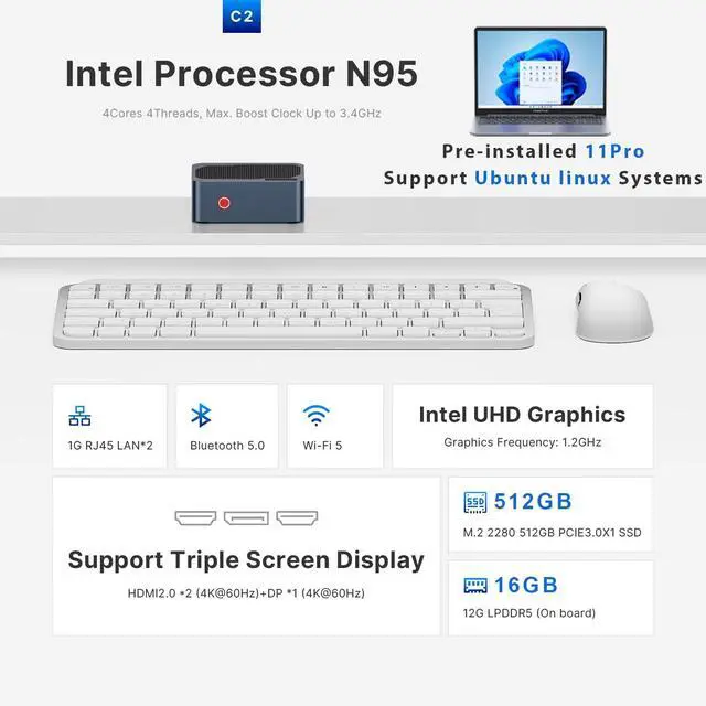 More Powerful CPU: N95The Origimagic C2 mini pc is powered by the Processor Intel N95 (4 cores, 4 threads, up to 3.40 GHz). Based on benchmarks, compared to previous low-power processors, its overall performance is significantly enhanced. Pre-installed with the Windows 11 Pro operating system and drawing just 15W of power, it enables you to efficiently handle daily work tasks. ^^ Memory and StorageThe N95 mini pc ships with 12GB LPDDR5 RAM (On board) and a 512GB M. 2 NVMe 2280 PCle x1 SSD (include), allowing you to run multiple high-performance tasks simultaneously. Fast data read/write speeds and ample storage capacity ensure smooth application performance. The mini computer comes with a versatile array of ports: 3x USB 3.2 Gen1, 2x 1000Mbps LAN, 2x HDMI 2.0, 1x DP, 1x Combo Jack, and 1x DC Jack. ^^ 4K Triple Display SupportThis micro pc powered by the N95 features Intel UHD Graphics (Max Dynamic Frequency 1.2 GHz) for faster image processing and 4K video playback. Thanks to 2x HDMI 2.0 ports and 1x DP port, it supports triple displaysexpanding your workspace and delivering an immersive 4K visual experience, boosting productivity. ^^ Dual 1000Mbps NIC LANThe mini pc equipped with Dual 1000Mbps ports. You can enjoy enhanced performance, reliable connections, bandwidth aggregation, and intelligent load balancing, high-speed home or office networks. Whether for office work, teaching, photo editing, home theater setups, or conference presentations, this mini PC handles it all with ease. ^^ Wi-Fi 5 & Bluetooth 5.0T he small pc delivers stable, reliable wireless connectivity for fast web browsing, smooth video streaming, and seamless office tasks. Built-in Bluetooth lets you connect multiple wireless devices: mice, keyboards, headphones, printers, monitors, and TVs. With high-speed wireless technology, youll enjoy consistent, efficient internet speeds for browsing and streaming. ^^ Advanced Cooling and Silent SystemThe portable mini pc features a compact chassis thats easy to carry, perfect for business trips. Advanced cooling technology keeps the system nearly silent under light loads and ensures it stays cool even during heavy use, making it very suitable for focused work. ^^ Reliable After-Sales ServiceThe Origimagic mini PC supports BIOS settings like Auto Power On and Wake on LAN.