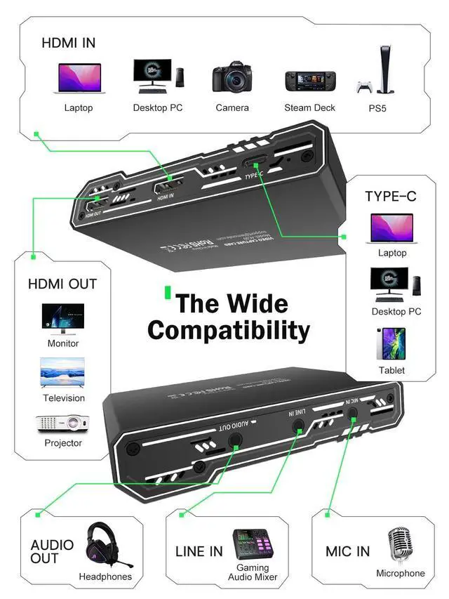 ^^ Comprehensive I/O Connectivity: Equipped with HDMI IN & OUT, USB-C, and AUDIO OUT ports for flexible setups. Easily connect gaming consoles, cameras, laptops, and monitors in a versatile streaming ecosystem.