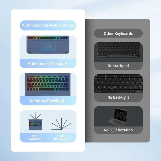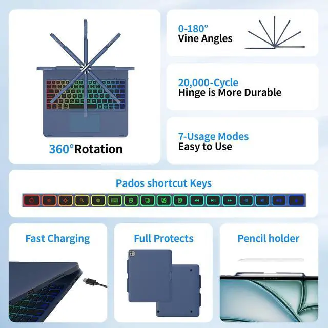 Backlight: The iPad 13 Pro keyboard includes a vibrant 7-color backlit feature with adjustable brightness settings. Enjoy excellent typing visibility in any lighting condition, complemented by a full set of PadOS multimedia shortcuts for effortless volume and music control. ^^ Usage Mode of Ipad Swivel