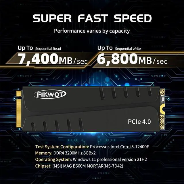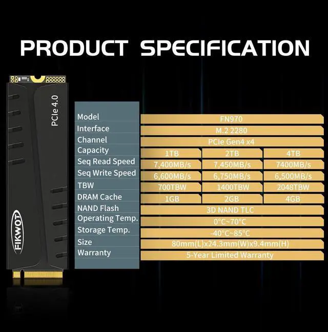 EXCELLENT PERFORMANCE: Fikwot FN970 4TB M. 2 SSD adopts M. 2 PCIe Gen4 x4 technology and is compatible with NVMe 1.4 protocol. The maximum read speed of this SSD is as high as 7, 400MB/s, and the maximum write speed is as high as 6, 800MB/s. It is equipped with a dynamic SLC cache to maintain the high-speed operation and stability of the SSD effectively ^^