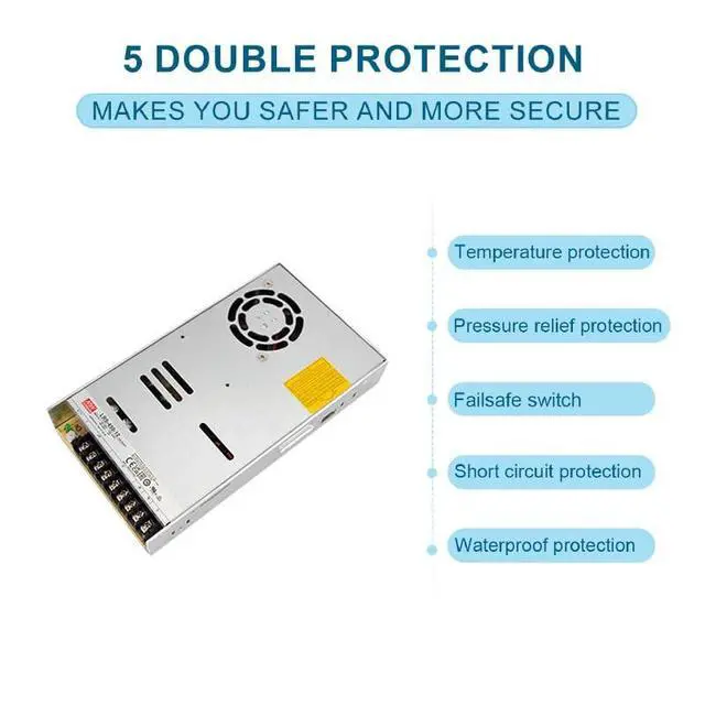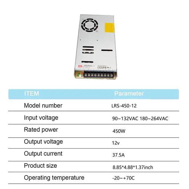 The DrapeMania LRS-450-12 is a 450W single-output enclosed switching power supply designed for demanding industrial applications. Its key features include high efficiency up to 90%, reducing energy consumption and operating costs. The compact 1U low-profile design (35mm height) allows for seamless integration into space-constrained systems. With a wide input voltage range of 90-264VAC, the LRS-450-12 adapts to diverse power environments, minimizing the need for external voltage converters. Built-in protections such as over-voltage (OVP), over-current (OCP), short-circuit (SCP), and over-temperature (OTP) ensure the safety and reliability of both the power supply and connected equipment.