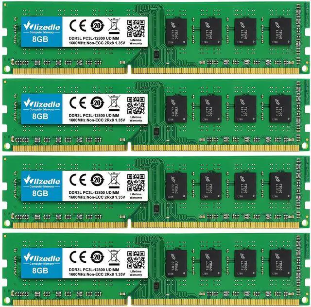 Memory: 32GB Kit Containing 4 x 8GB Modules, DDR3 / DDR3L, U-DIMM (Unbuffered DIMM), PC3-12800u / PC3L-12800u, 1600MHz, 240 Pins, 1.35 Volt / 1.5 Volt, 2Rx8 Dual Rank, Non-ECC, CL11.
