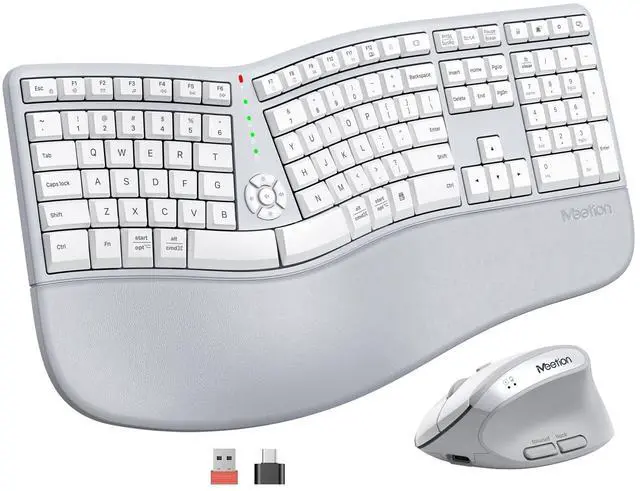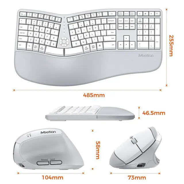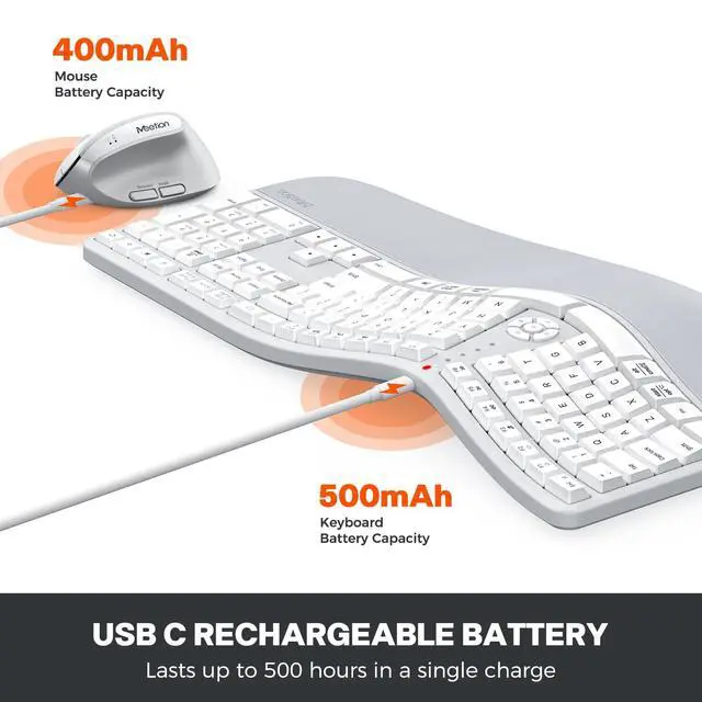 PU material (Size: 18.8 * 4.9 in), delivering solid and reliable support for your hands and wrists. The firm construction ensures superior stability and prevents sagging or shifting during typing. Enhanced with a non-slip surface for added grip. This ergonomic design, combined with firm support, effectively alleviates wrist strain and significantly reduces the risk of musculoskeletal disorders associated with prolonged keyboard use. ^^ VERTICAL ERGONOMIC MOUSEUnique vertical design offers optimal ergonomics, with adjustable DPI settings (800/1200/1600/2400)to suit various tasks and preferences, ensuring accuracy and speed when needed, a silent switch, and a side-scrolling wheel, catering to all your needs. The mouse and keyboard share a common USA-A receiver. ^^ RECHARGEABLE AND LONG LASTING Featuring a 500mAh and 500mAh rechargeable battery in both the keyboard and mouse, providing long-lasting performance for extended use. The battery holds power for up to 1-2 months of usage on a single full charge. You can focus on work and worry less about charging. (Charge your keyboard and mouse before you use them. We recommend using the 5V 1A charging specification. ).