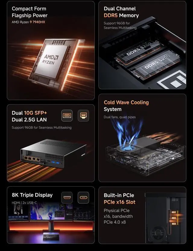 Excellent PerformanceThe MINISFORUM MS-A2 Mini Workstation is equipped with AMD Ryzen 9 7945HX(16 cores/32 threads/up to 5.2 GHz). featuring the built-in AMD Radeon 610M Graphics (Graphics frequency 2.2 GHz), it can handle computing tasks smoothly and better for multitasking. ^^ Super Fast Network SpeedThe MS-A2 workstation comes with two 10G SFP+ ports, each supporting a 10 Gbps transfer rate and link aggregation, which is ideal for users demanding ultra-fast wired network connections to high-speed LANs, network storage devices, servers etc. It also includes two 2.5G RJ45 ports. Its suitable for connecting to high-speed home and office networks and other scenarios requiring rapid network transfers.