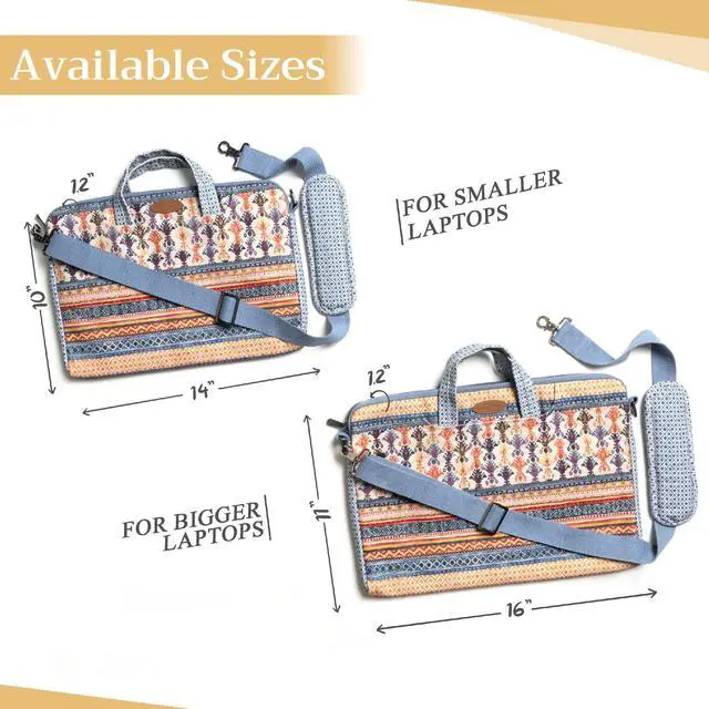 Artsy Designs and Vibrant patterns in vibrant colors provide huge visual interest, setting our bags apart. It is a versatile choice for just daily use, travel or commuting and a true delight to carry around. ^^ Comes in two sizes o Small 14 Width, 10 Length, 1.2 Deep (Outer dimension) Compatible with 12- 13.3 Laptops / Ultrabooks, 13- 13.5 Laptops / Notebooks / Ultabooks. o Large 16 Width, 11 Length, 1.2 Deep (Outer dimension) Compatible with 15 Macbook air / Macbook pro, 15.3 ipad pro and most 14- 14.56 Laptops / Notebooks / Ultrabooks.